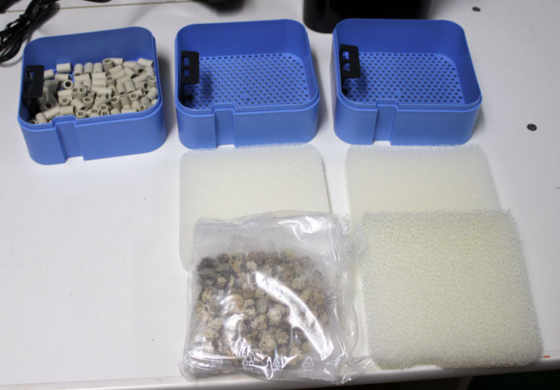Несмотря на то, что в 1-й и 2-й корзине лежат довольно мелкопористые губки, мы бы посоветовали положить сверху небольшой слой фильтрующей ваты – например, sera filter wool, для тонкой фильтрации воды от механических частиц.