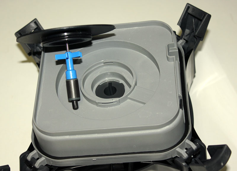 Голова фильтра пристёгивается к корпусу при помощи 4-х клипс, расположенных в углах фильтра – фиксация производится плотно и надёжно. Адаптер для крепления шлангов также фиксируется в голове фильтра – сегодня это довольно распространённая схема.