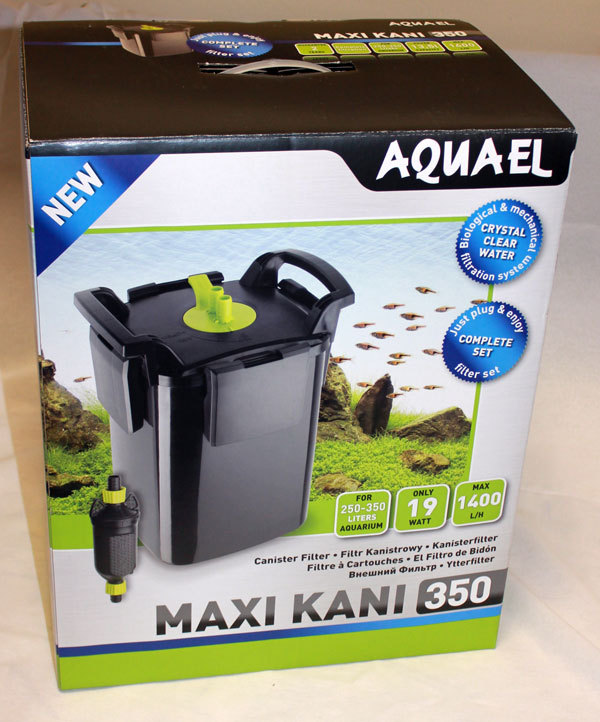 В нашей распаковке сегодня мы возьмём одну из популярных моделей – MAXI KANI 350. Производитель рекомендует его для аквариумов объёмом от 250 до 350 литров, но смело можем сказать, что и на 100 литров вы совершенно спокойно можете его поставить – «перебора» не будет, в крайнем случае – уменьшите производительность кранами (это никак не повлияет на долговечность или надёжность, вопреки распространённому мнению).