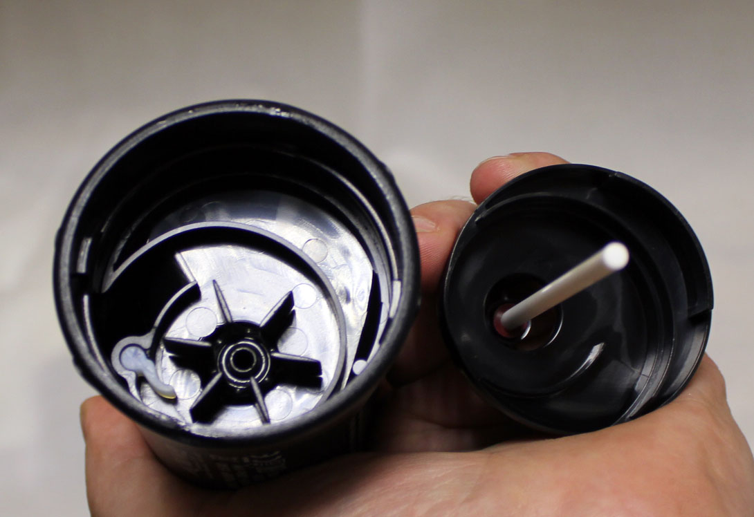 Так помпа выглядит внутри – керамическая ось (она очень долговечна и обеспечивает тишину в работе, но будьте осторожны – если уронить на твёрдый пол – сломается), а слева, рядом с ротором находится специальный стопор, которое обеспечивает вращение ротора только в одном направлении, так как при включении в сеть в таких типах моторов возможно начало вращения как по часовой стрелке, так и против неё.