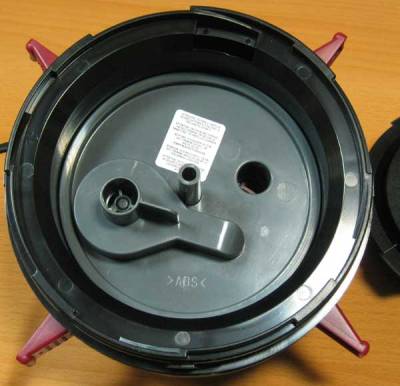На наклейке, которую хорошо видно на фото, написано на 5 языках (к сожалению, исключая русский) о том, что для снятия крышки необходимо вынуть пробку системы первоначального запуска фильтра.