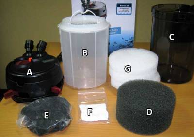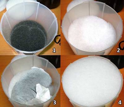 «Стоп, стоп, стоп» - скажет искушенный аквариумист, – «а где же биокерамика?». Действительно «биокерамики» (так обычно называют специальные наполнители для заселения полезными бактериями) в комплекте фильтра нет, хотя на коробке фильтра, в предлагаемой схеме укладки наполнителей, она присутствует.