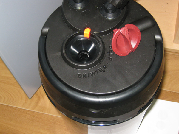 Теперь надо как-то заполнить его водой. У «классических» фильтров Eheim Classic, например, это пришлось бы делать при помощи рта, сделав глубокий вдох из выходного шланга. У более современных моделей (например, Tetra EX, Eheim Professionel 3 и других) это можно сделать при помощи специальной кнопки. У Hydor Prime всё устроено несколько иначе.